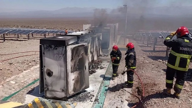 2020年10月,阿根廷圣胡安省Ullum地區(qū)太陽能園區(qū)集中逆變器發(fā)生的大火。消防員到達(dá)現(xiàn)場時(shí),發(fā)現(xiàn)許多逆變器著火了,火焰吞沒了逆變器和連接電線的機(jī)柜,經(jīng)過搶救火災(zāi)得到控制。