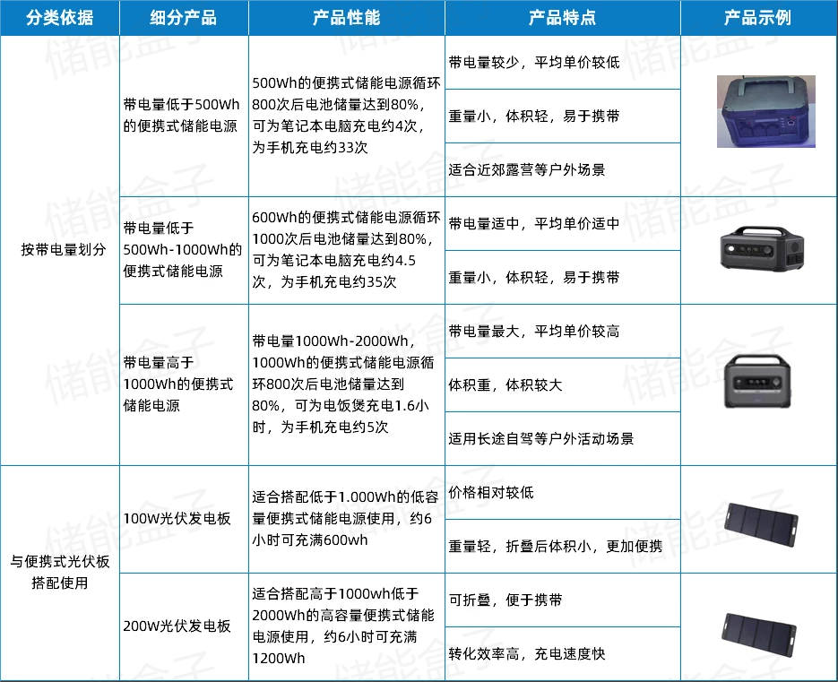 按照功率能量存儲可將便攜式儲能分為低于500Wh、500-1000Wh、高于1000Wh的電源;與之搭配的太陽能光伏板,現(xiàn)在市面上比較主流的功率有100W和200W。
