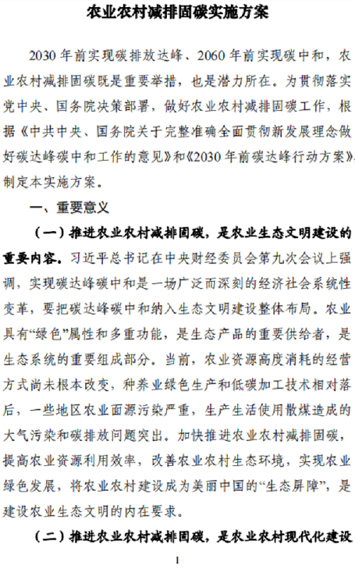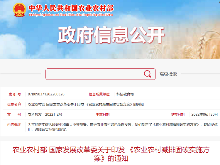 農(nóng)業(yè)農(nóng)村部 國家發(fā)展改革委關(guān)于印發(fā) 《農(nóng)業(yè)農(nóng)村減排固碳實施方案》的通知
