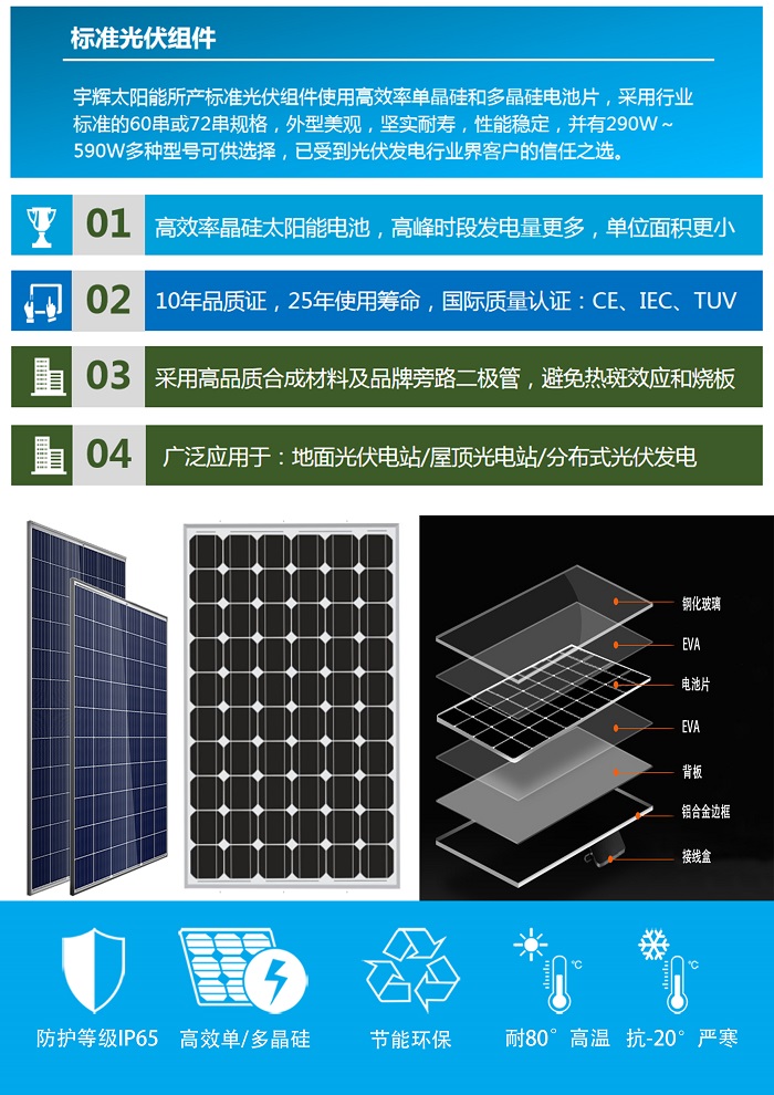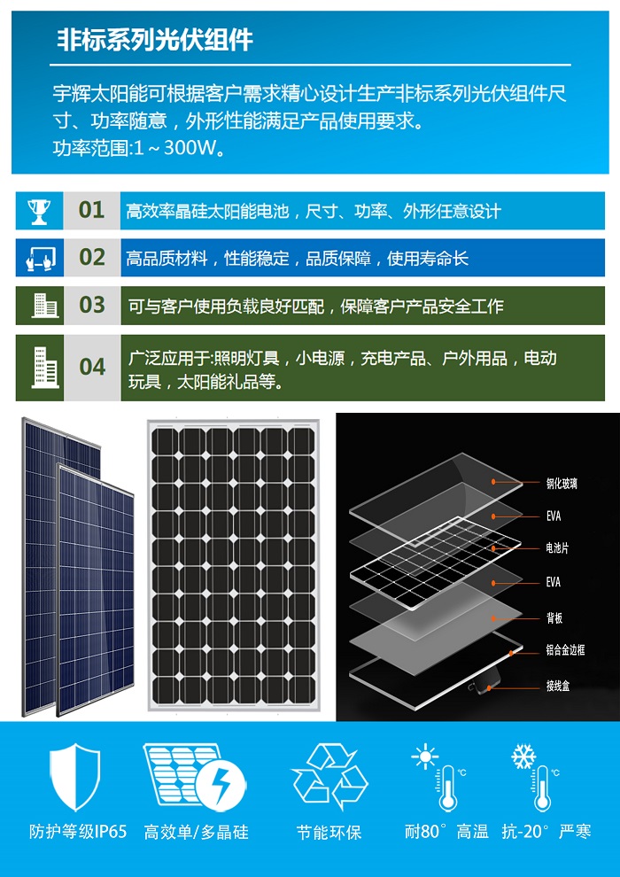 宇輝太陽(yáng)能可根據(jù)客戶(hù)需求精心設(shè)計(jì)生產(chǎn)非標(biāo)系列光伏組件尺寸、功率隨意,外形性能滿(mǎn)足產(chǎn)品使用要求。